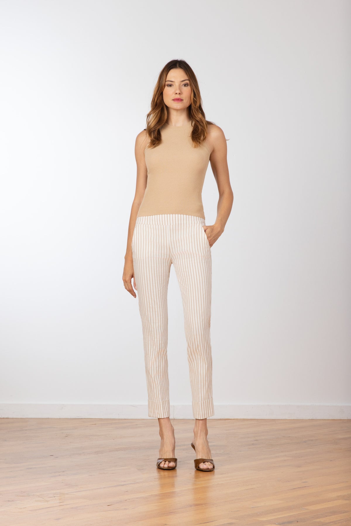 THE FIT: The BEN style is a straight leg, ankle-length, pull-on pant with side pockets and a cuff. Perfect to be worn conservatively for work or playfully for dinner.